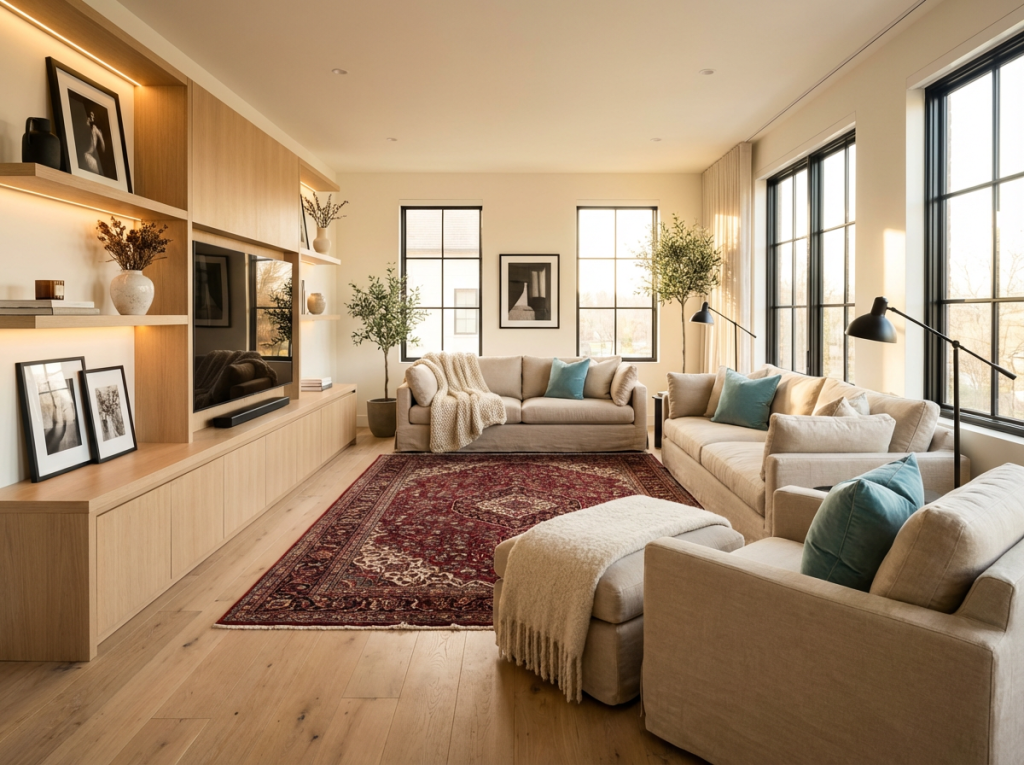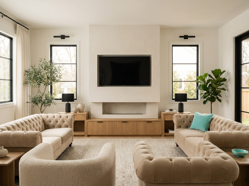 Woonkamer Warm zand muur + eiken tv-meubel + matte black lampen. Tiffany in 1 fauteuil of 2 kussens. Plaid in wol of bouclé.