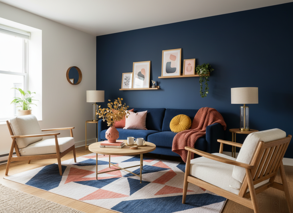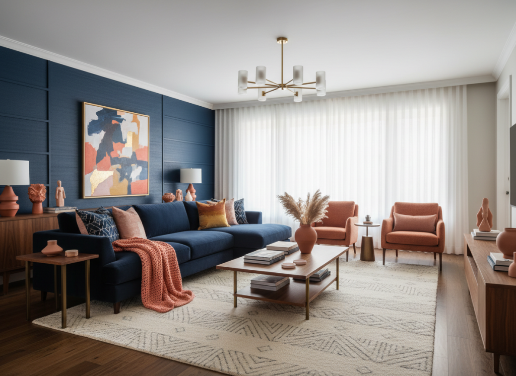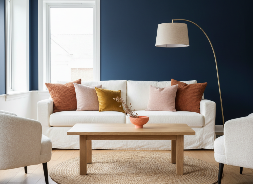 In de woonkamer werkt dit palette meteen sfeervol, omdat navy blue hier veel diepte kan geven zonder dat de ruimte onrustig wordt. Denk aan een donkerblauwe muur achter de bank, gecombineerd met een lichte bank in zand of warm wit. Voeg daarna kussens toe in terracotta en blush pink, en laat één accessoire in coral of mustard yellow terugkomen.