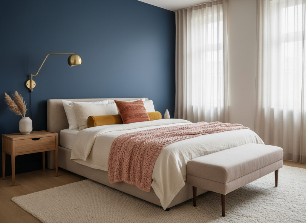 In de slaapkamer voelt navy blue vaak rustgevend, vooral als je het gebruikt op de muur achter het bed of in het beddengoed. De combinatie met blush pink maakt het zachter en meer ontspannen. Terracotta voegt warmte toe, terwijl gold hier mooi werkt in een wandlamp, lijst of nachtkastdetail.