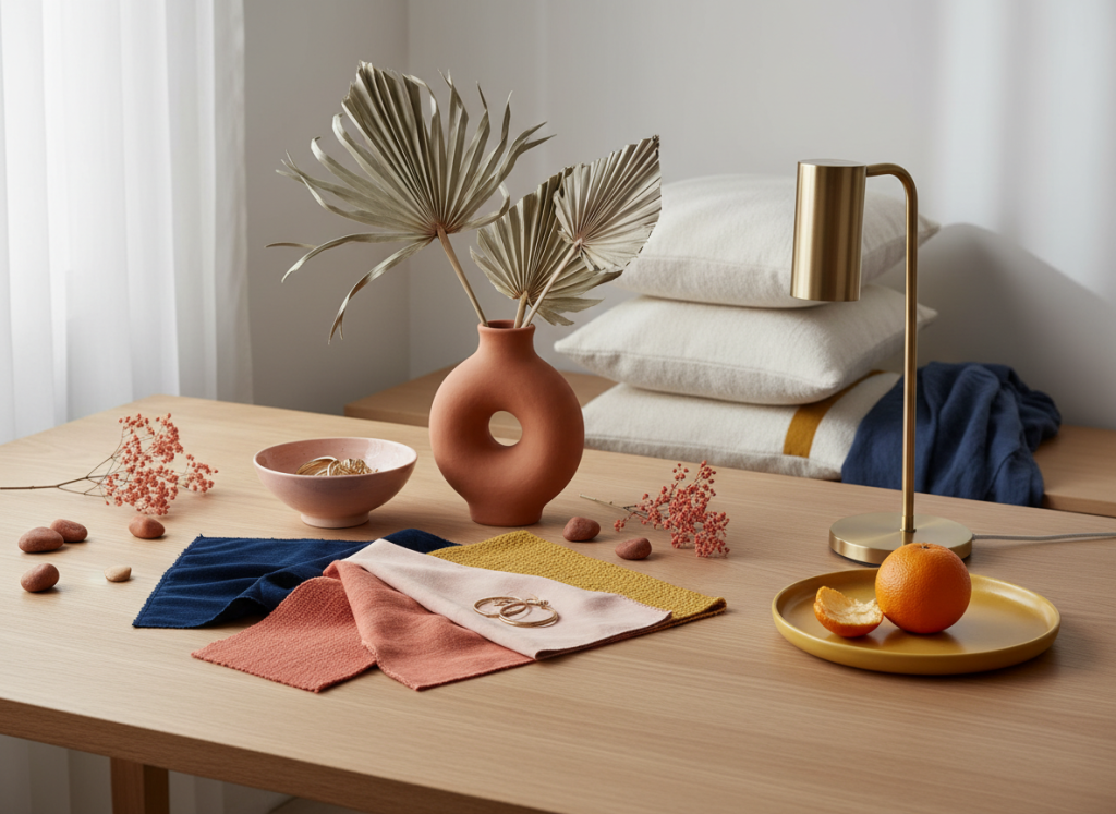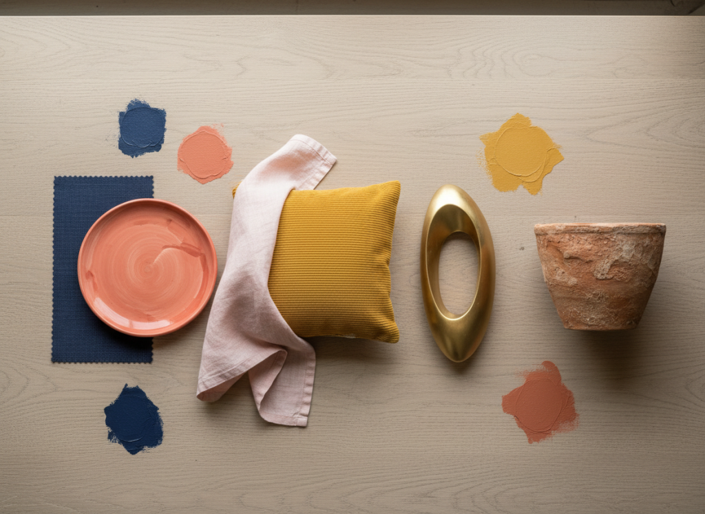 De eerste fout is te veel verzadigde kleuren tegelijk gebruiken. Als coral, mustard yellow en terracotta allemaal even aanwezig zijn, wordt het palette snel druk. Kies liever één dominante accentkleur en laat de rest ondersteunend zijn.