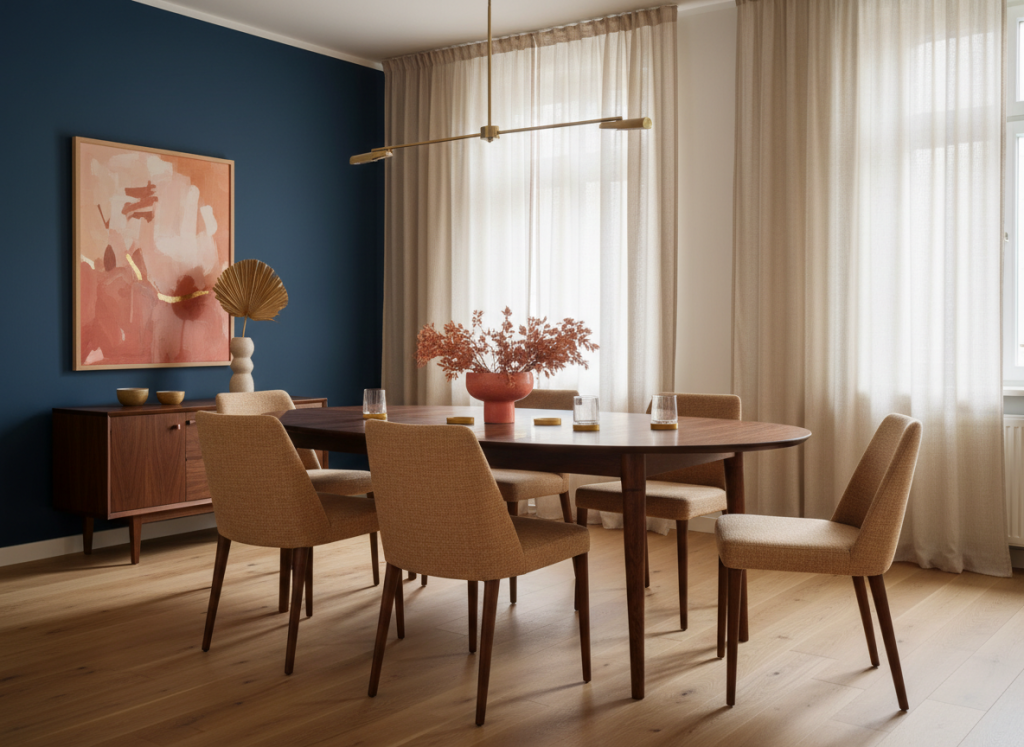 Een eethoek mag vaak net iets meer spanning hebben. Navy blue op de wand geeft direct diepte, zeker in combinatie met hout. Met eiken voelt het lichter en moderner, met walnoot juist rijker en meer boutique hotel. Coral of mustard yellow kunnen hier verrassend goed werken in kunst, servies of een stoelbekleding, terwijl terracotta de ruimte warmer maakt.